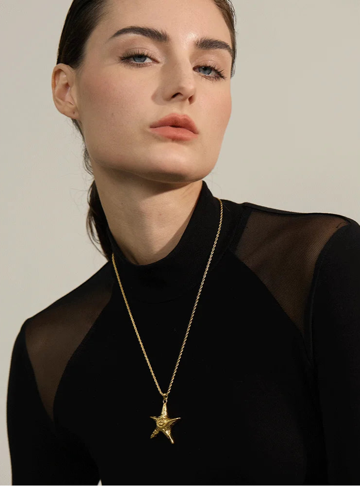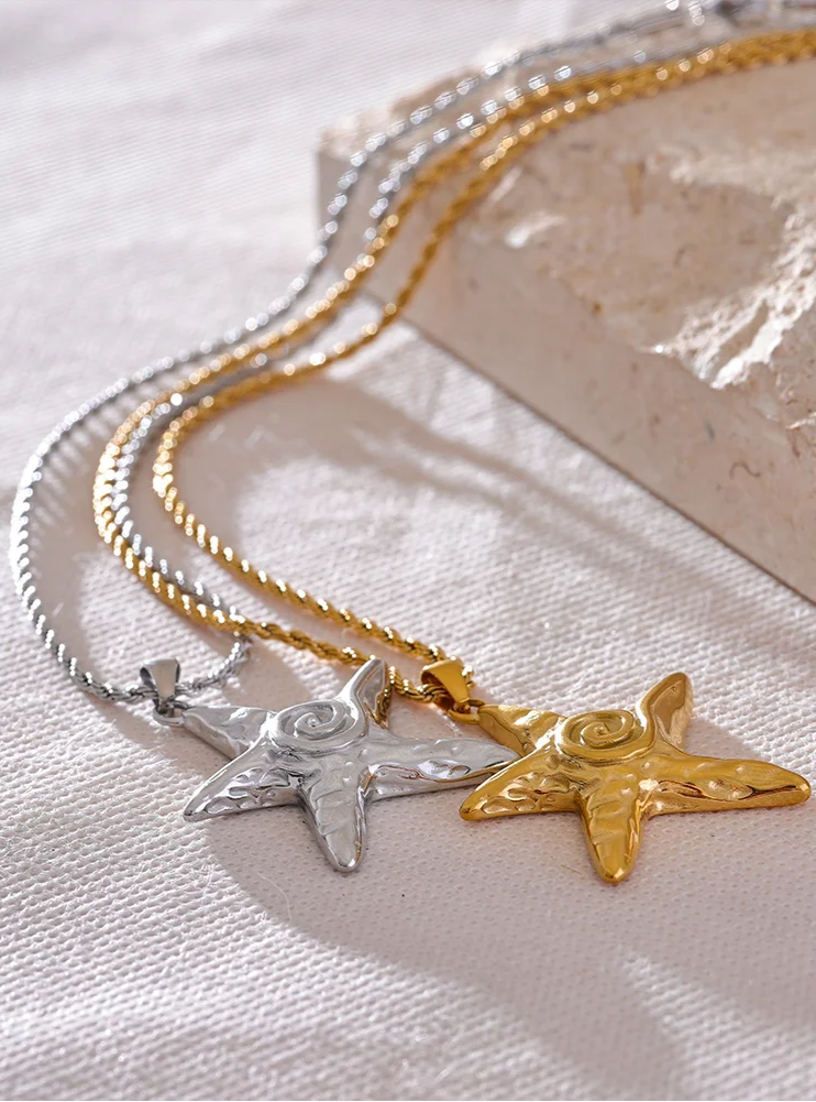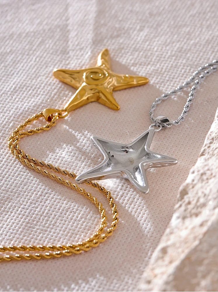Statement necklace featuring a twisted rope chain and bold starfish pendant. Lightweight yet striking – perfect for summer looks and special occasions.