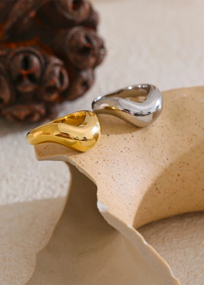 Minimalist design with fluid curves inspired by golden waves. A simple yet sophisticated ring that blends modernity with timeless elegance.