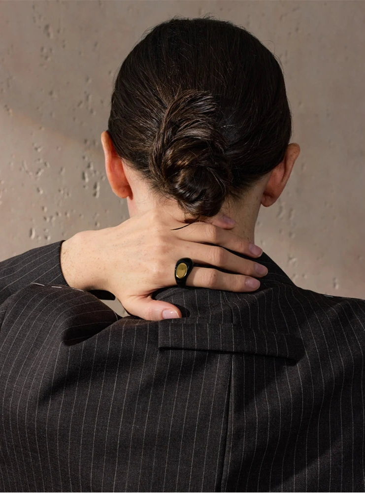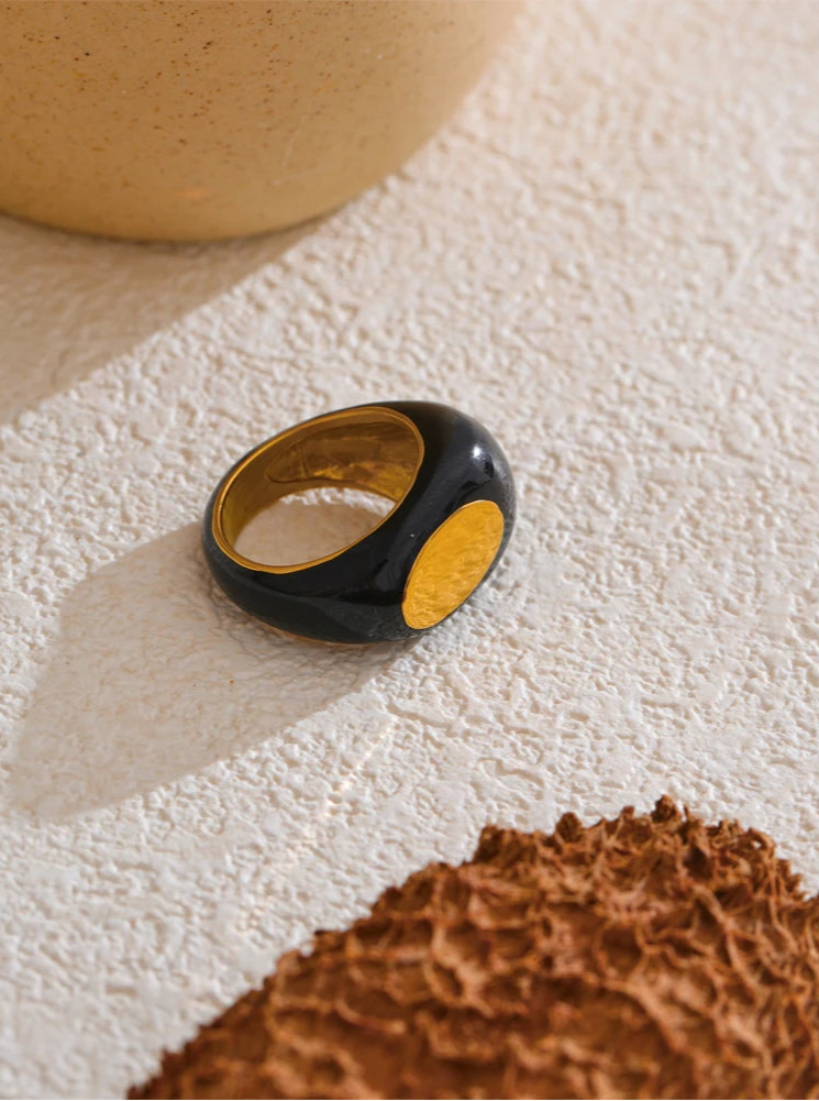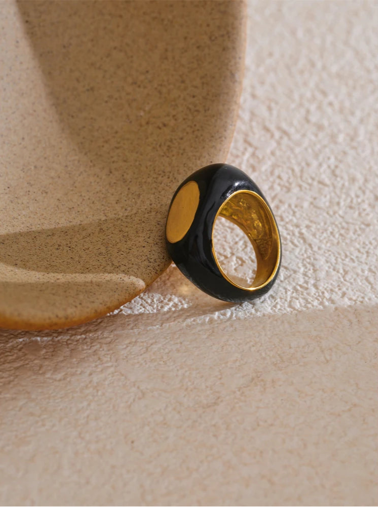 The contrast of deep ebony enamel with the radiant golden interior creates a striking minimalist luxury effect.