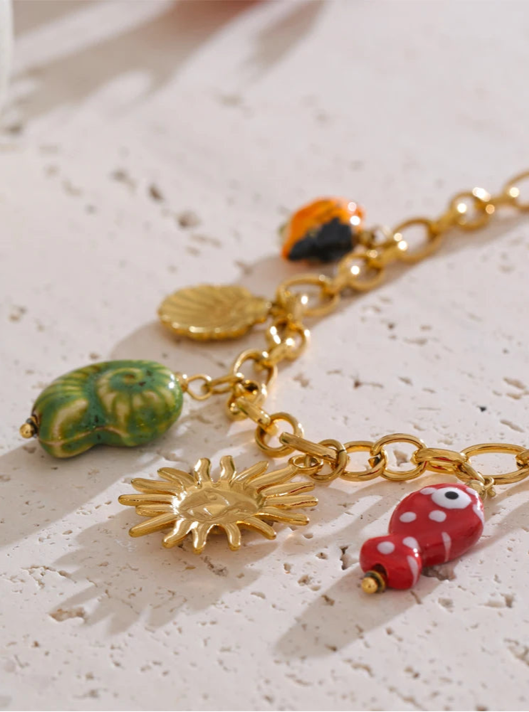 Gold PVD-plated stainless steel with colorful ceramic charms and golden details.