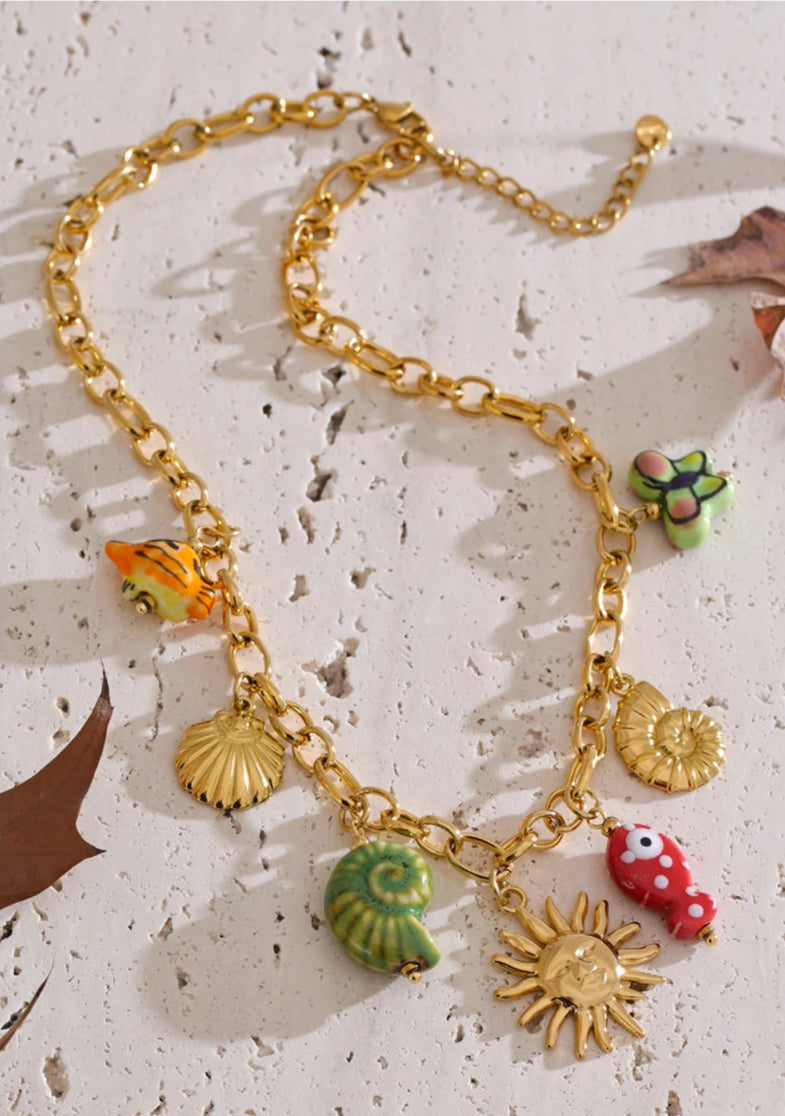 Fun charms in the shape of a sun, seashells, fish, and butterfly β a joyful celebration of seaside life with a Y2K retro aesthetic.