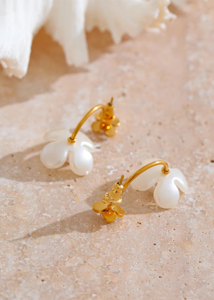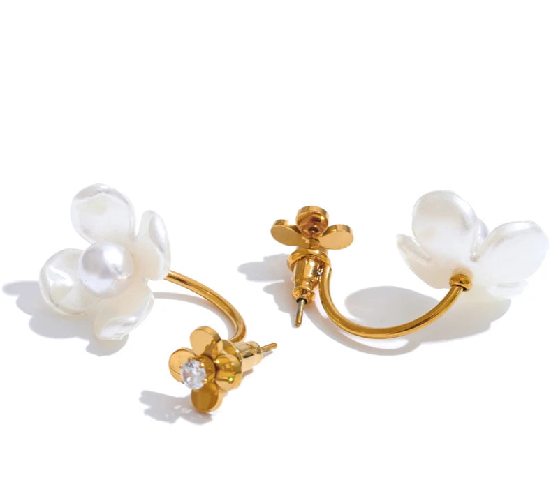 316L stainless steel with 18K PVD gold plating, handcrafted resin flowers and simulated pearl centerpiece.