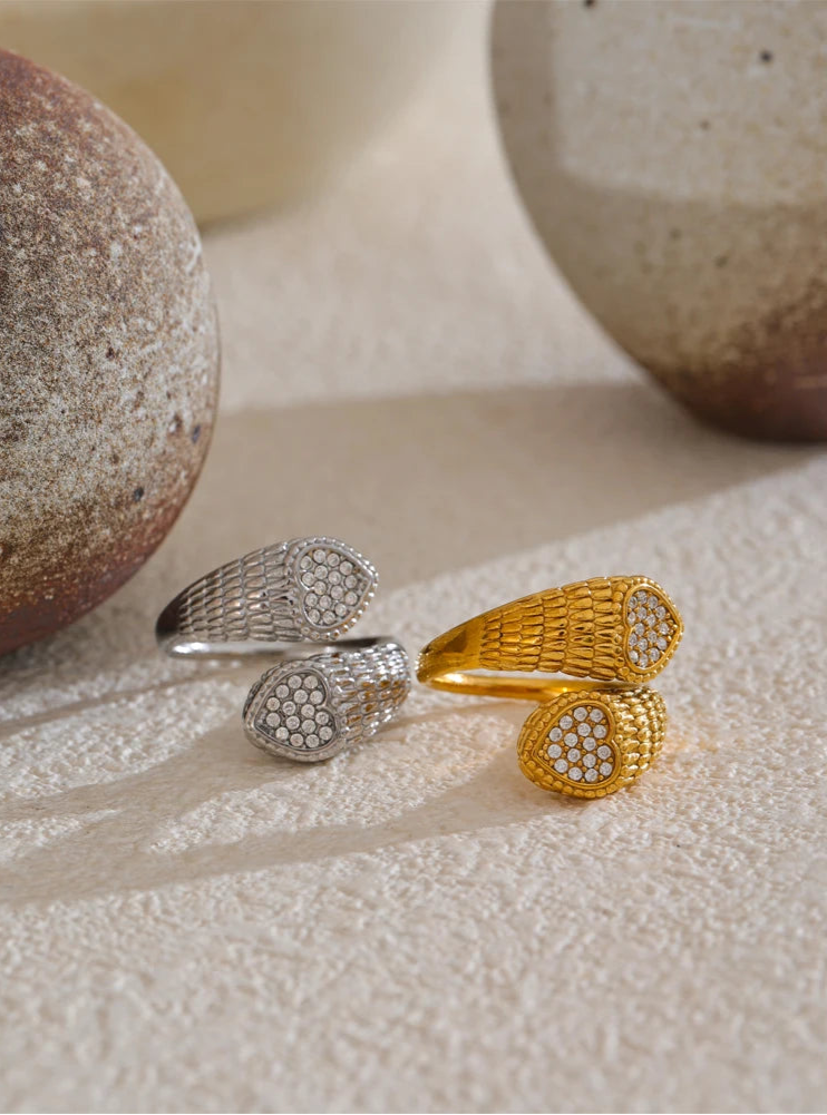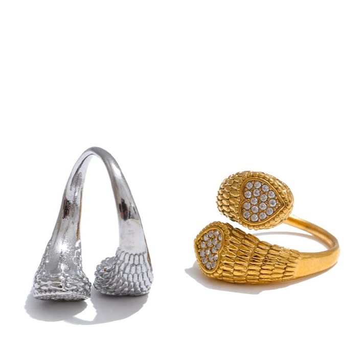 Adjustable wrap-around ring featuring snake-inspired texture and zirconia heart details. Comfortable, trendy, and bold.