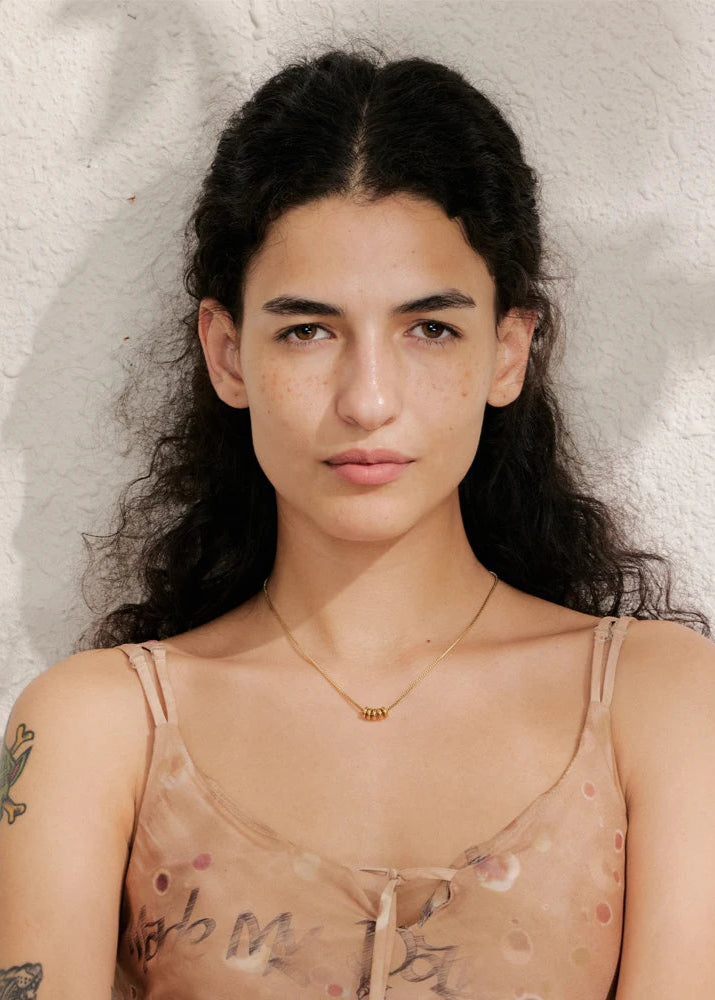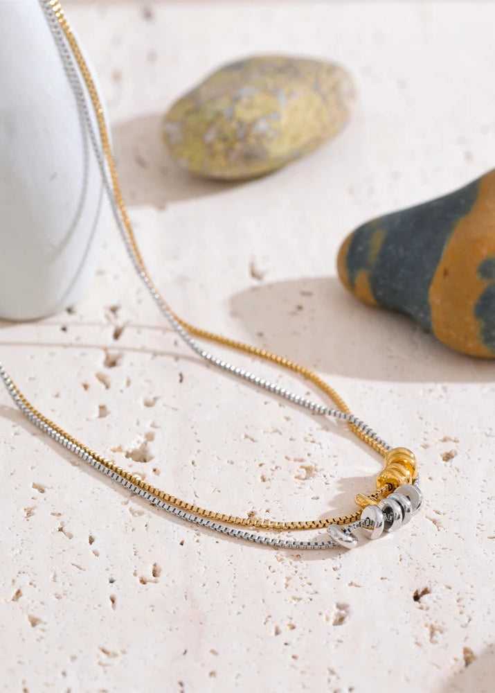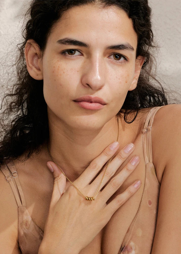 316L stainless steel with 18K PVD gold plating, featuring five polished round golden rings that move freely along the chain.