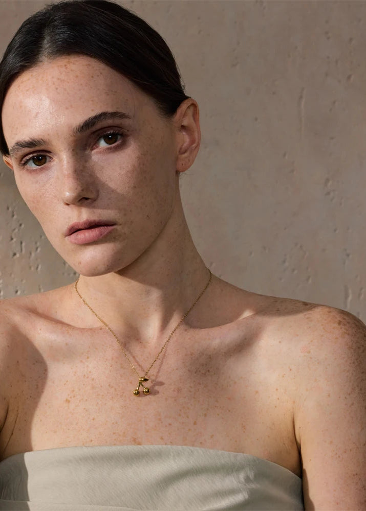 Pingente de cereja dourada simbolizando juventude, frescor e sensualidade em um design atemporal.